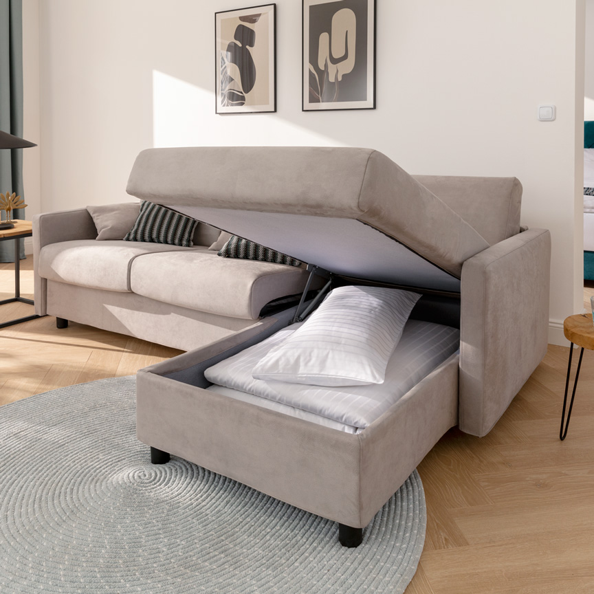 Gerade in Ferienapartments oder Familienzimmern ist das ein echtes Plus: alles ist direkt im Sofa griffbereit verstaut. So bleibt das Zimmer ordentlich.